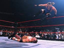 Zeca fica no chão. Miz então puxa Zeca para perto das cordas, vai para o lado de fora e salta fazendo um Springboard Leg Drop!